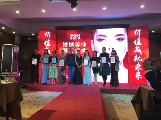 頒獎嘉賓蔡永忠副主席為“2016中國博納美業(yè)紋飾培訓(xùn)誠信企業(yè)獎”的的得主們頒獎